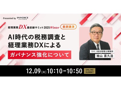 この度、株式会社インボイス(本社:東京都千代田区、代表取締役社長:仁多見 斎、以下「インボイス」)は、2025年12月9日(火)に開催する無料オンラインカンファレンス【経理業務DX最前線サミット 2025 Winter ~次世代の経理へ デジタルとAIによる業務プロセス改革13選~】へSKJ総合税理士事務所(所長・税理士:袖山 喜久造 本社:東京都千代田区)の袖山 喜久造氏の登壇が決定したことをお知らせいたします。