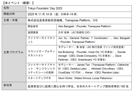 株式会社産業革新投資機構(本社:東京都港区、代表取締役社長CEO:横尾敬介、以下「JIC」)は、2025年11月14日、Transpose Platform Management, LLC(以下「Transpose」*)、国内最大規模のスタートアップカンファレンスを運営する「IVS」(代表:島川敏明、以下「IVS」)と共同で、「Tokyo Founder's Day 2025」(以下「本イベント」)を開催しました。Transposeの投資先でシリコンバレーを拠点とする世界屈指のアクセラレーターである Y Combinator(以下「YC」)の卒業生も登壇し、起業家並びに起業に関心を持つ学生、日本のスタートアップ関係者等約 180 名が参加しました。