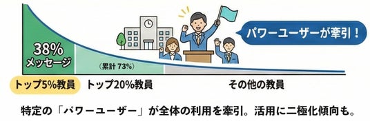 これは、多くの学校において、まずは特定の「先行者(イノベーター・アーリーアダプター)」が熱心に活用し、そこから徐々に周囲へ波及していくという普及モデルを示唆しています。裏を返せば、全教員が一斉に同じペースで使い始めることは稀であり、導入初期においては「誰がその学校のトップ5%になり得るか」を見極め、支援することが重要です。