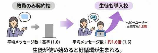 教員のみが契約している学校と、生徒も利用している学校を比較したところ、生徒導入校では教員1人あたりの平均メッセージ数が約1.6倍に達しました。また、教員のうち利用回数の多いヘビーユーザーの出現度合いも、生徒導入校では約1.6倍となっており、「生徒が使い始めることで、先生自身の活用も加速する」という好循環が確認されました。