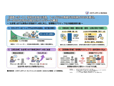 学校向け生成AIプラットフォーム「スタディポケット」を提供するスタディポケット株式会社(本社:東京都千代田区、代表取締役:山地 瞭/鶴田 浩之)は、全国の小中高校における教員・生徒の生成AI利用データ(約500万件)を統計的に分析した、学校現場の生成AI活用実態レポート(2025年冬版)を公表いたします。