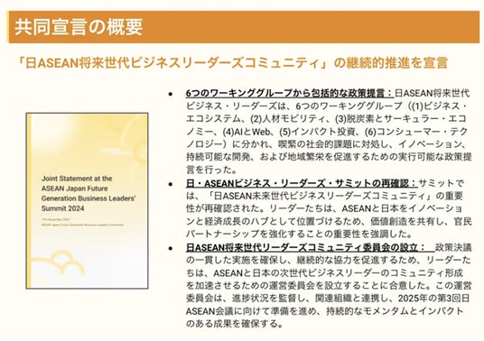 2024年12月に、各国から35名の20代の若手起業家たちが京都市に集まり、社会課題に対する政策提言を共同宣言としてまとめました。日本とASEANの若手ビジネスリーダーが主体となって、リーダー間の交流を加速するための委員会を立ち上げるための合意などが盛り込まれています。