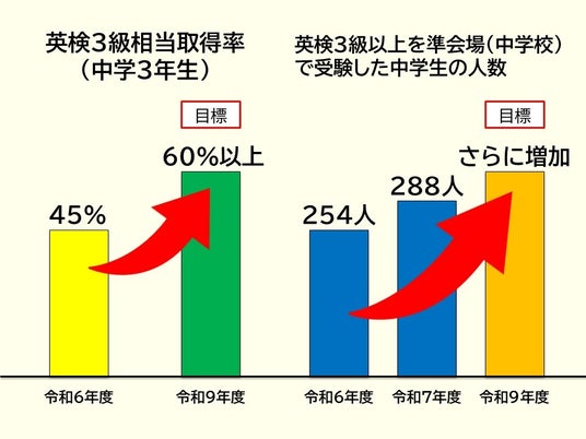 2024(令和6)年度の市立中学3年生の英検3級相当取得率は45%。英語教育の拡充を通じて、2027(令和9)年度までに取得率を60%以上に向上させることを目指しています。さらに受験者の増加も成果指標とし、挑戦する機運を醸成することで学習意欲を高めています。