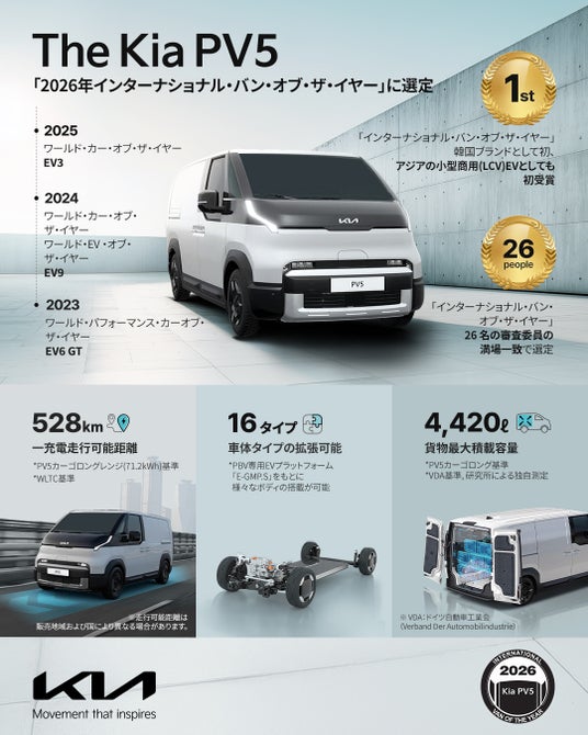 Kia PBVジャパン株式会社(本社:東京都千代田区、代表取締役社長:田島靖也、以下、Kia PBVジャパン)が来春日本国内で発売するThe Kia PV5(以下、「PV5」と呼称)が、商用車業界で世界最高権威とされる賞を受賞する快挙を成し遂げました。