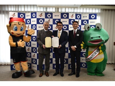 なお、11月25日(火)に、豊中市役所応接室にて包括連携協定締結式が開催され、大阪エヴェッサからは代表取締役 磯村英孝、エヴェッサ事業部 事業部長 藤村 貢、公式マスコットキャラクター まいどくんが出席しました。
