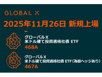 大和証券グループのGlobal X Japan株式会社(東京都千代田区、代表取締役社長:藤岡 智男、以下「当社」)は、本日11月26日に、東京証券取引所へ「グローバルX 米ドル建て投資適格社債 ETF」【468A】、「グローバルX 米ドル建て投資適格社債 ETF(為替ヘッジあり)」【467A】を新たに上場したことをお知らせします。