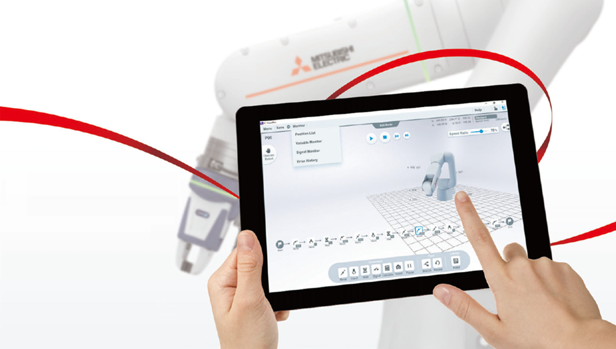 Unityで製作された協働ロボットASSITA用のソフトウェアです。高精彩のロボットシミュレータと直感的な操作でアームを動かして位置を記憶させる「ダイレクトティーチング」や画面のタッチ操作による「ビジュアルプログラミング」を実装しておりはじめてロボットを取り扱う方でも簡単に・すぐに使うことが可能です。