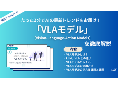 株式会社APTO(本社:東京都、代表取締役:高品良)は、ロボティクスや自動運転技術に使われる「VLAモデル」に関する資料を無料で公開いたしました。