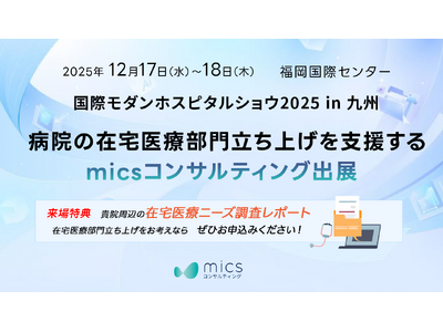 在宅医療経営に特化したコンサルティング会社、メディカルインフォマティクス株式会社(本社:東京都千代田区、代表取締役:佐々木美樹、以下mics)は、2025年12月17日(水)・18日(木)に開催される「国際モダンホスピタルショウ2025in九州」に出展し、病院向けの在宅医療部門立ち上げ支援サービスを紹介します。