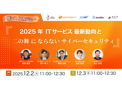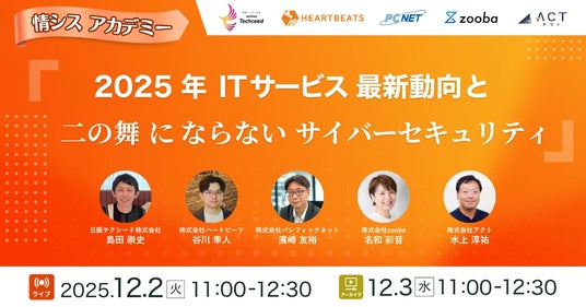 日販テクシード株式会社(本社:東京都中央区、代表取締役社長:藤澤 徹、以下 日販テクシード)は、ITとセキュリティ分野で強力な製品・サービスを取り扱う5社共同で「【情シスアカデミー】2025年ITサービス最新動向と二の舞にならないサイバーセキュリティ」を開催いたします。