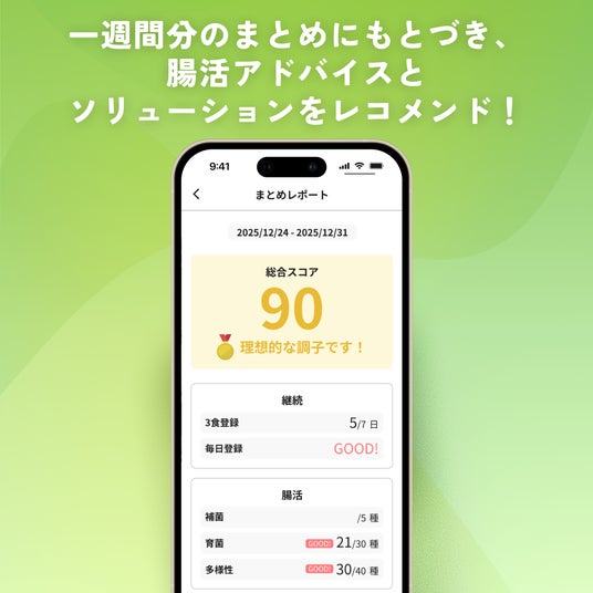 ・日々の記録内容から、栄養バランス、補菌・育菌、運動量などをもとに、「腸活スコア」をリアルタイムに計測。