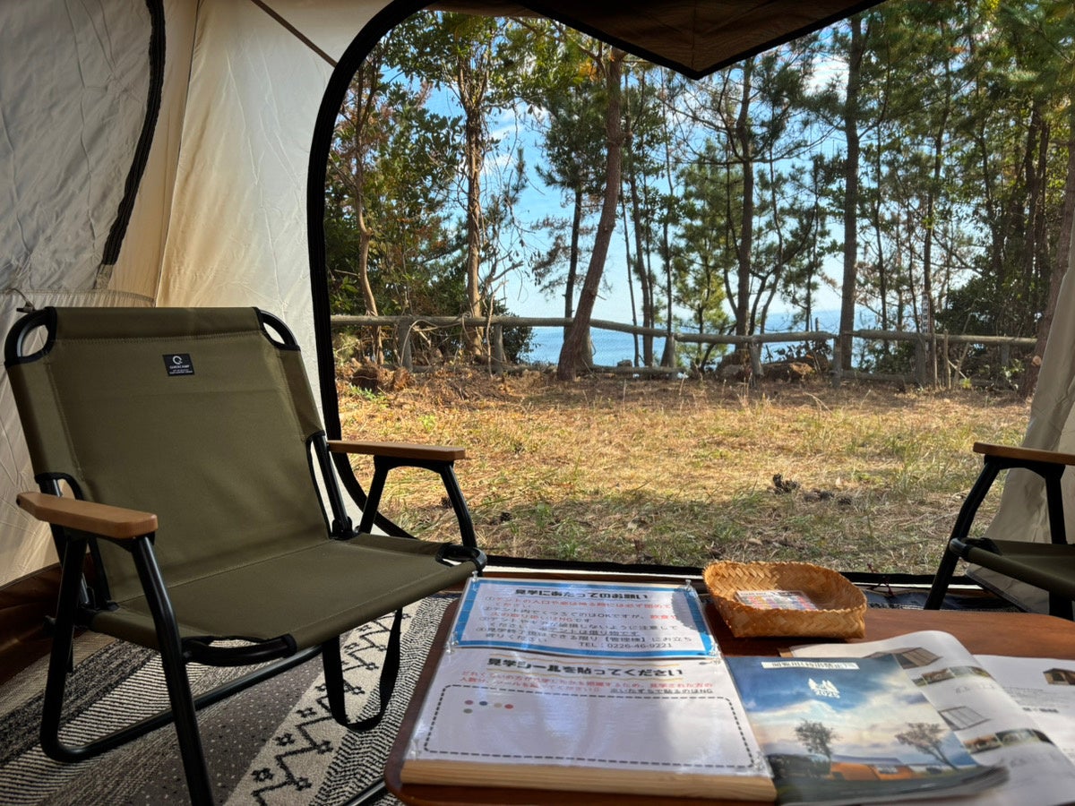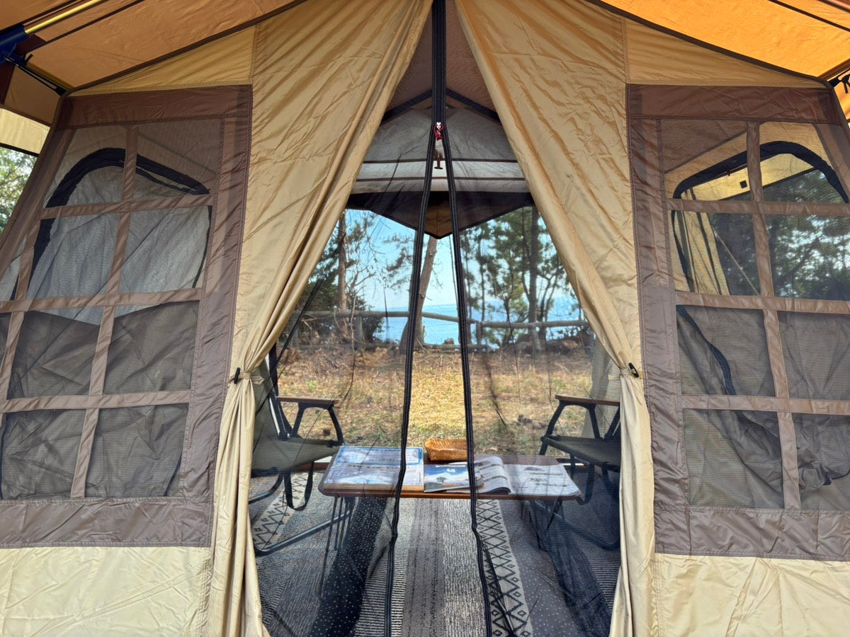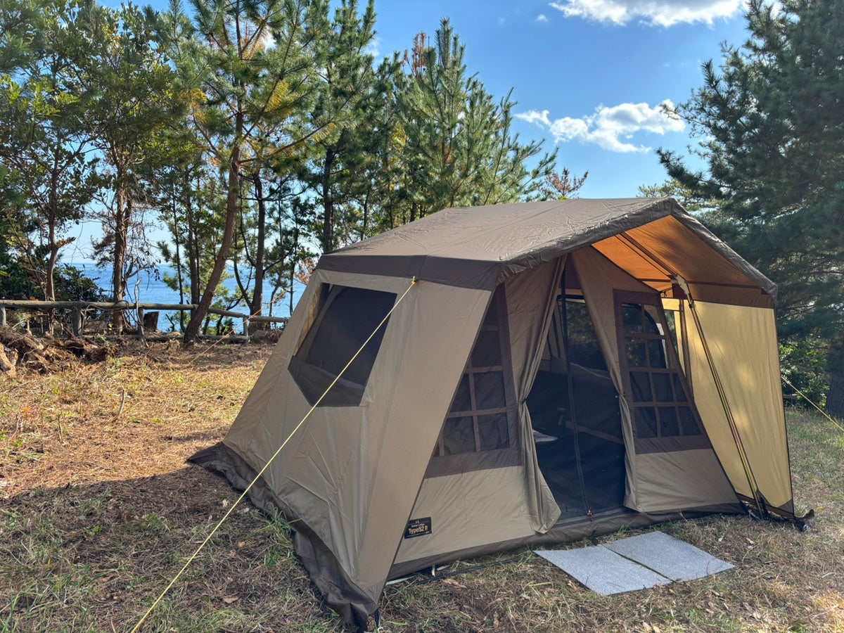 展示されている神割崎キャンプ場だと目の前に広がる海をテントの中から見ることができるため、ロケーションとの相性もすごく良いテントです。