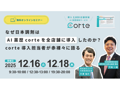 クラウド電子薬歴『CARADA 電子薬歴 Solamichi』の企画・開発・販売を行う株式会社ソラミチシステムは、無料オンラインセミナー「なぜ日本調剤はAI薬歴corteを全店舗に導入したのか!?corte導入担当者が赤裸々に語る」を12月16日(火)、18日(木)に開催します。