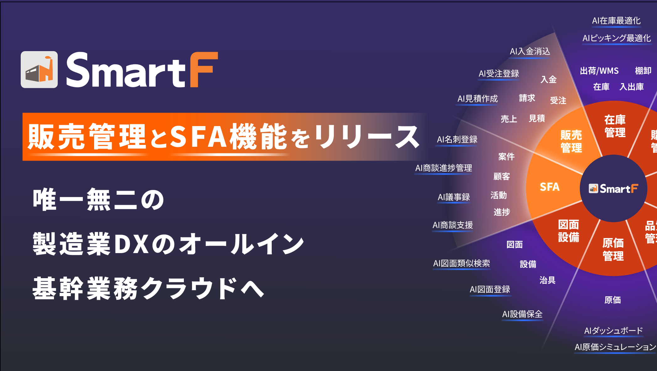 これによりSmartFは、「生産管理クラウド」から、製造業の生産と営業のDXをオールインワンで実現する唯一無二の「基幹業務クラウド」へと進化します。
