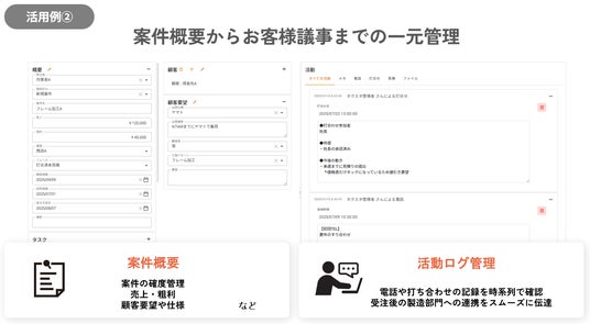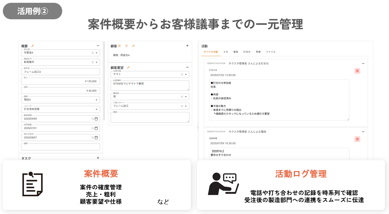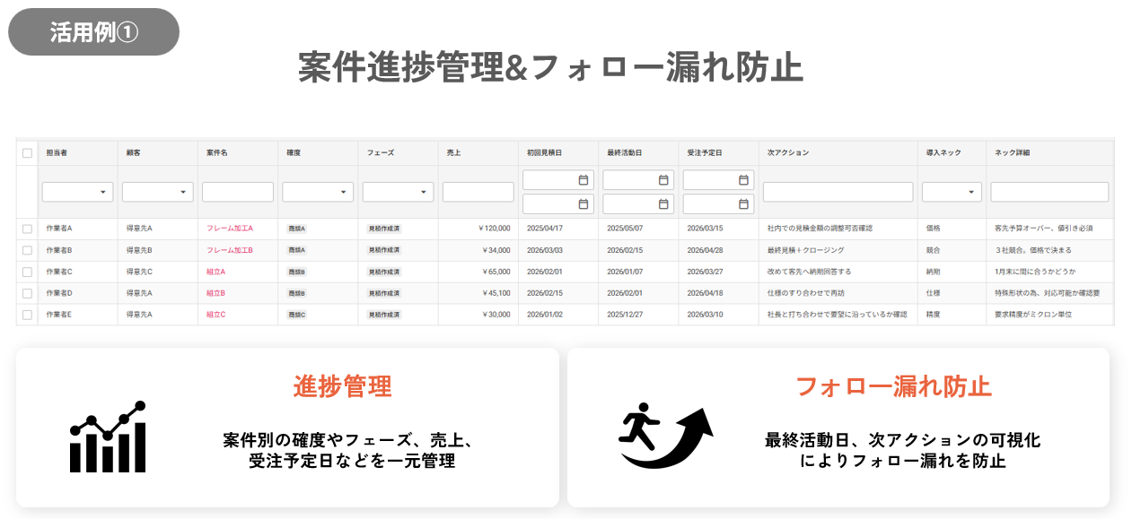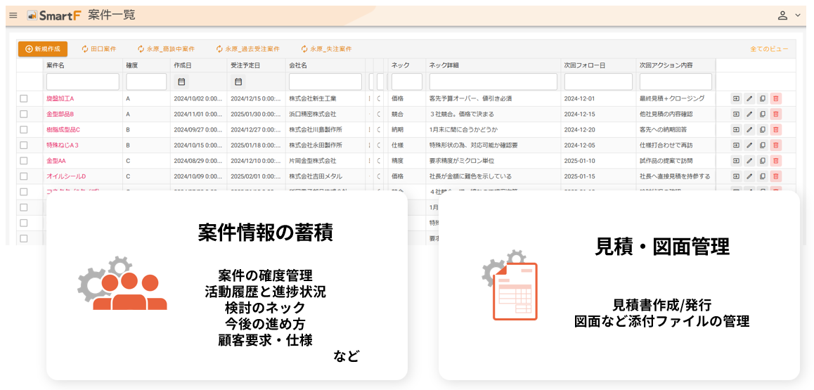 - 案件管理:案件情報(進捗、確度、次アクション、金額など)の管理