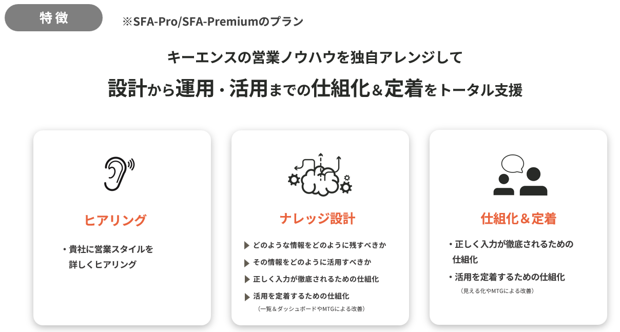 この課題に対し、キーエンス出身である当社代表の永原が、キーエンスで学んだ営業ノウハウや仕組化を参考にし、製造業特有の課題や営業スタイルも考慮して、SFAを開発しました。