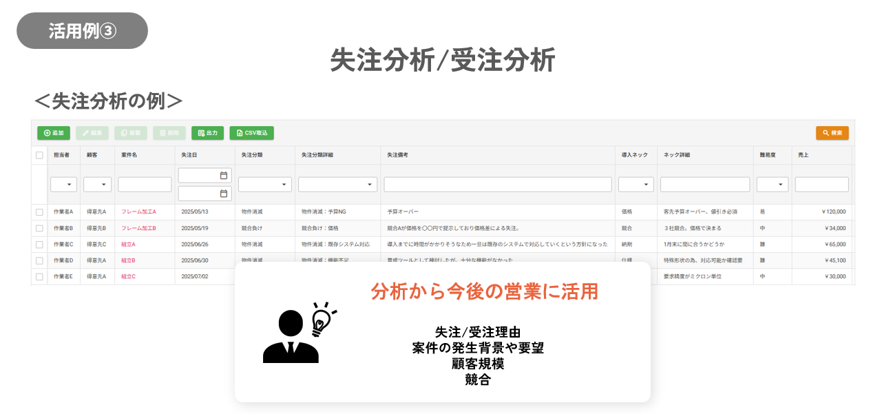 受注率の向上: 失注理由の可視化により、競合差別化、製品企画、適切なターゲット選定、PRトークの改善などの参考となり、受注率の向上に貢献します。