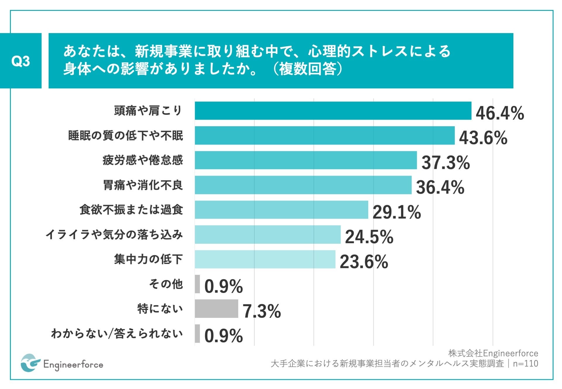 「Q3.あなたは、新規事業に取り組む中で、心理的ストレスによる身体への影響がありましたか。(複数回答)」(n=110)と質問したところ、