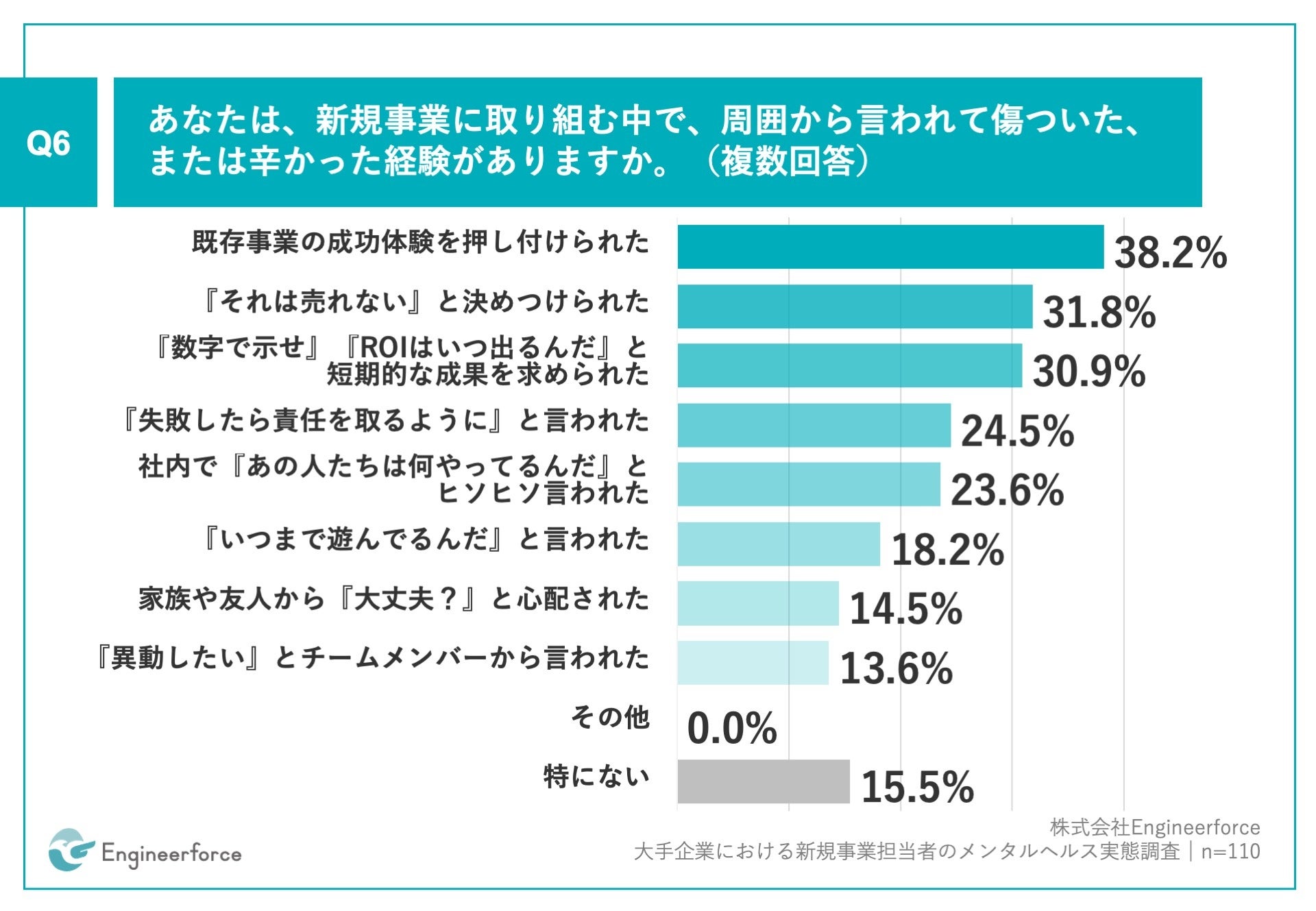 「Q6.あなたは、新規事業に取り組む中で、周囲から言われて傷ついた、または辛かった経験がありますか。(複数回答)」(n=110)と質問したところ、
