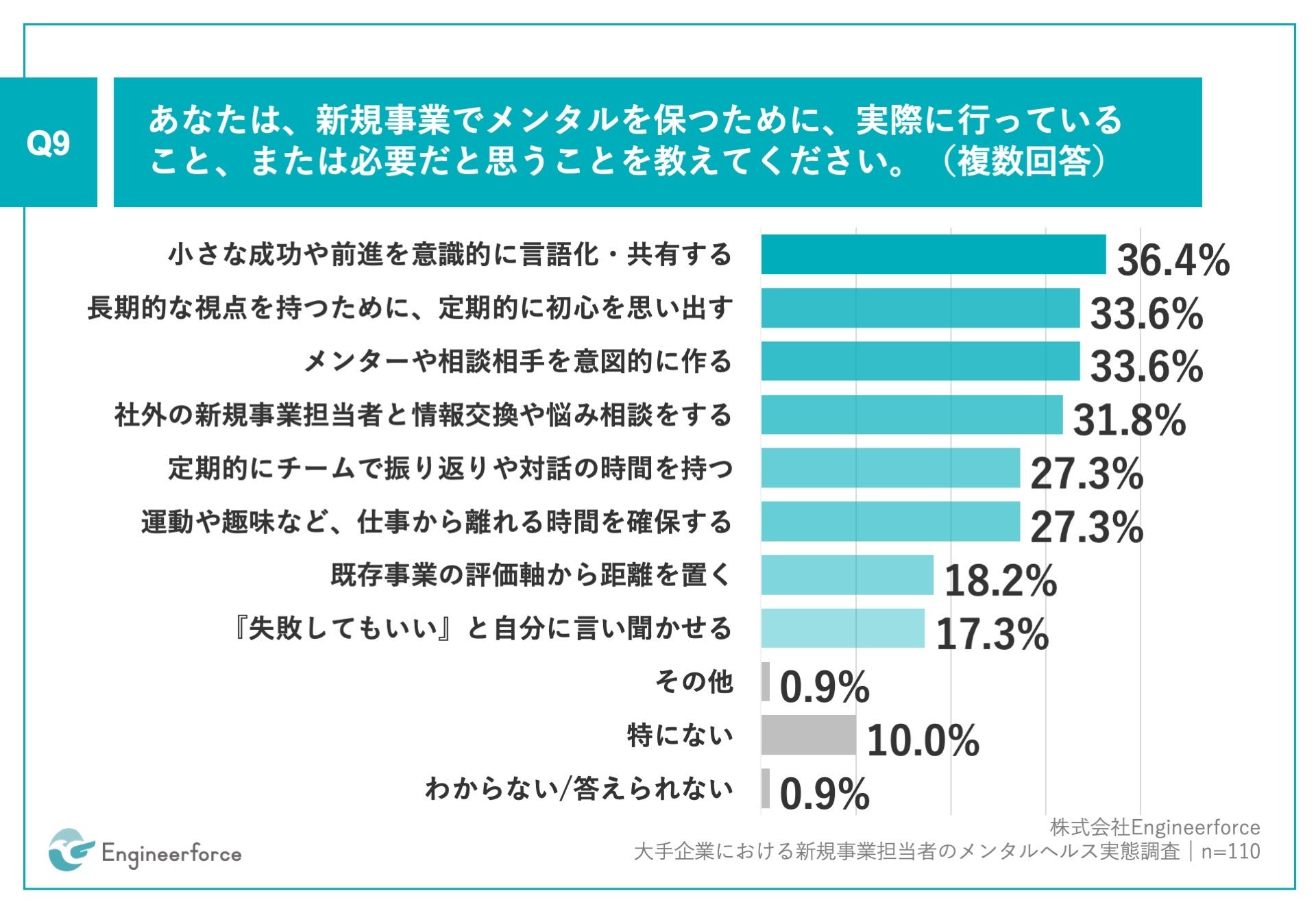 「Q9.あなたは、新規事業でメンタルを保つために、実際に行っていること、または必要だと思うことを教えてください。(複数回答)」(n=110)と質問したところ、