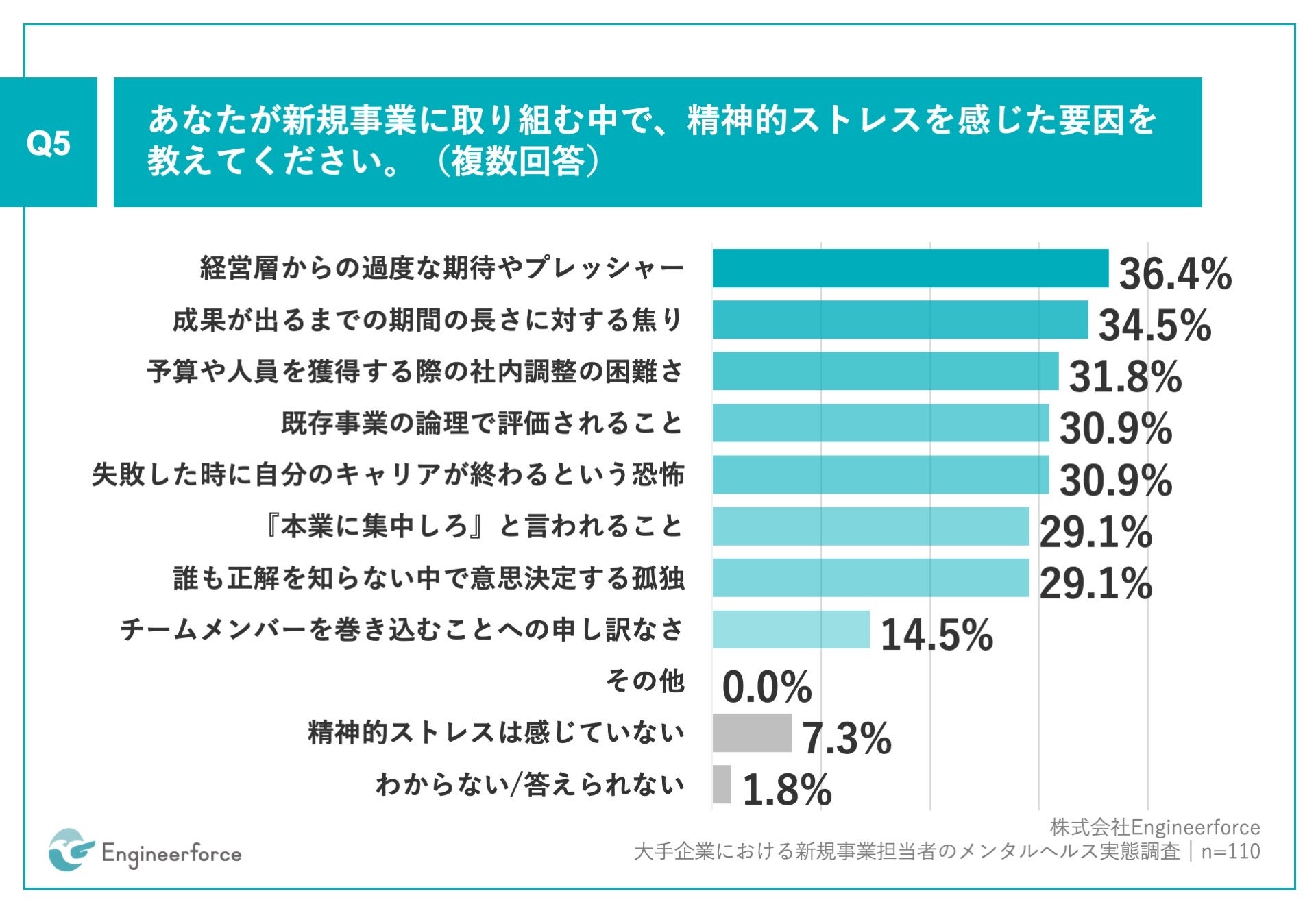 「Q5.あなたが新規事業に取り組む中で、精神的ストレスを感じた要因を教えてください。(複数回答)」(n=110)と質問したところ、