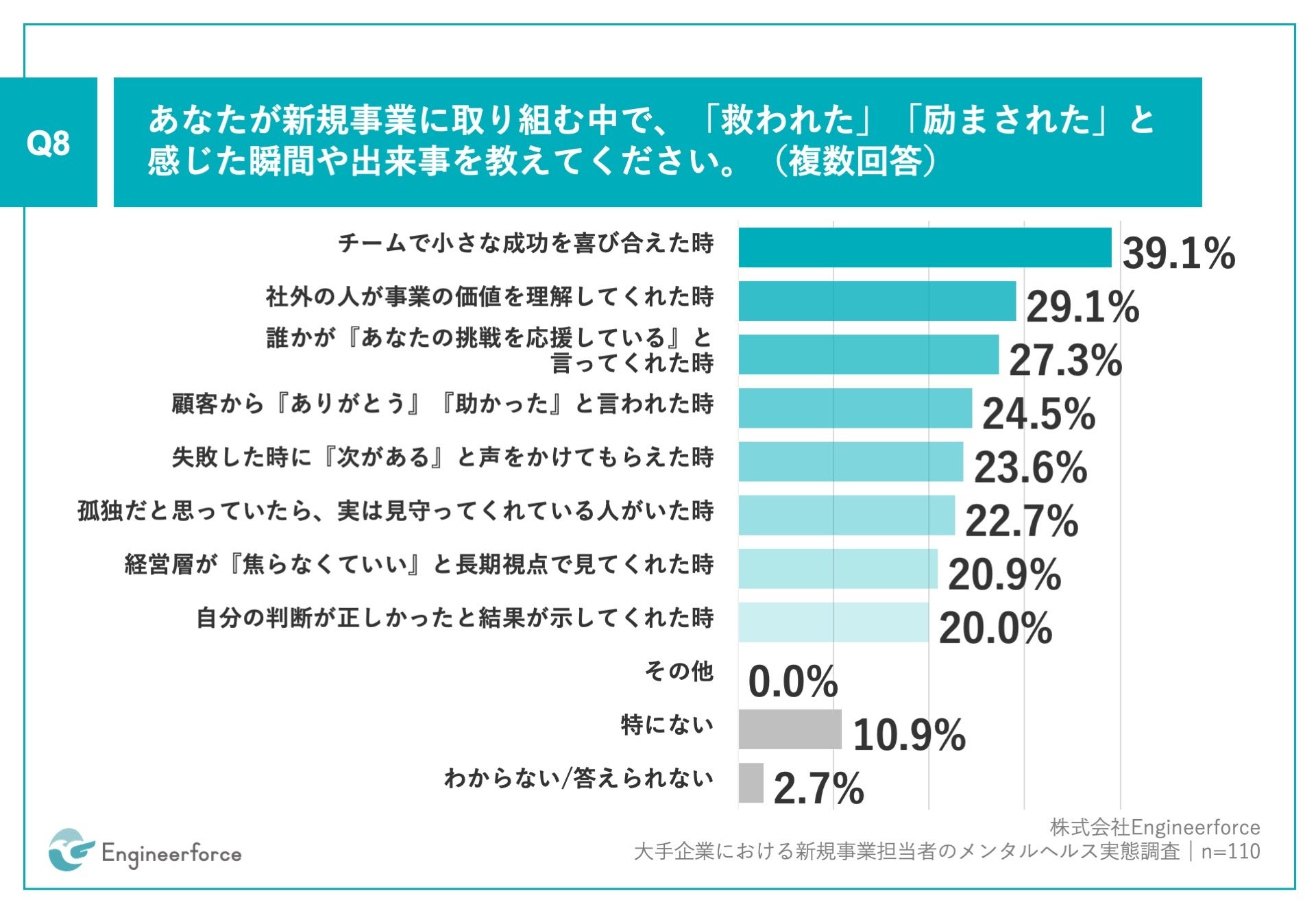 「Q8.あなたが新規事業に取り組む中で、「救われた」「励まされた」と感じた瞬間や出来事を教えてください。(複数回答)」(n=110)と質問したところ、