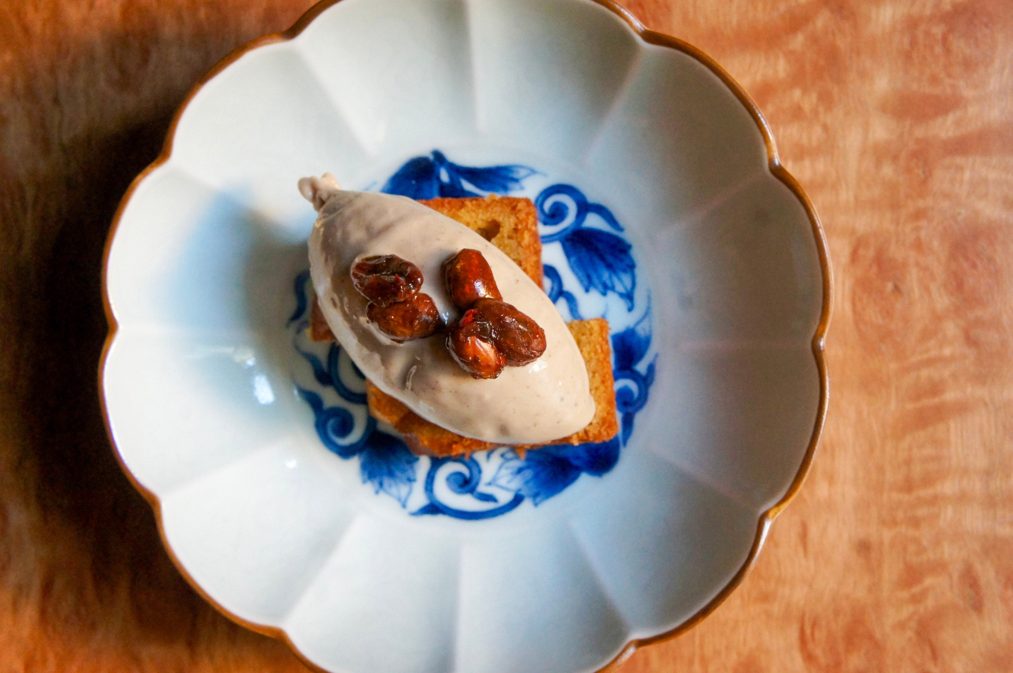 マッサマンカレーをイメージしたスパイスを使用したオリエンタルなソルベ添え。