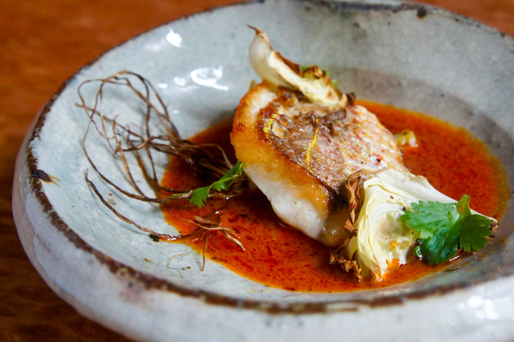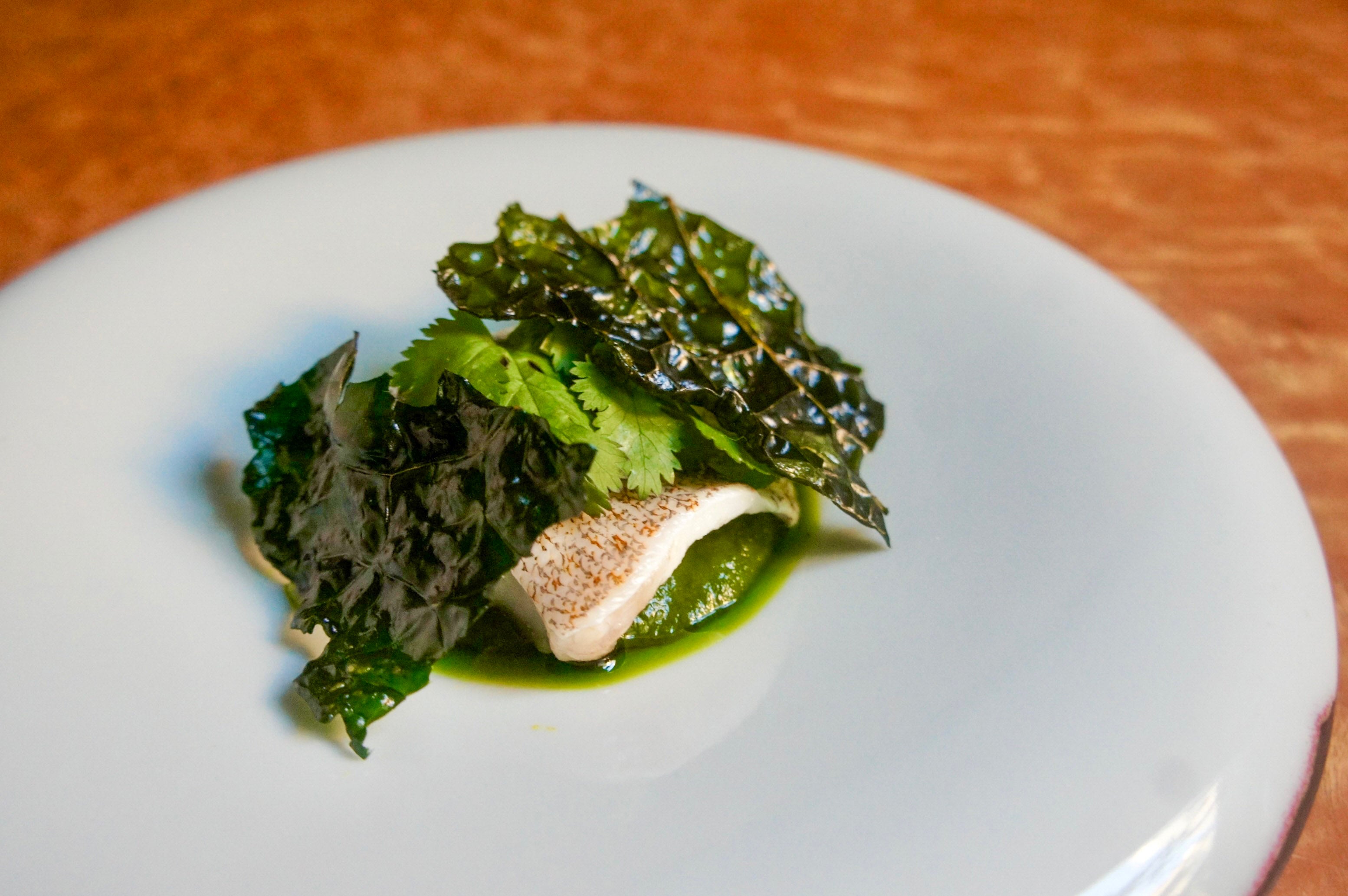 蒸しあげた旬の白身魚とキャベツのピューレ、青唐辛子とライムのドレッシングで和えたパクチーサラダ。