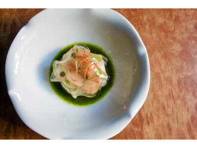 栃木県産の蕪のムースに、トムヤムナムサイという酸味のあるクリアなスープをジュレシートにした物。赤海老のマリネ、バイマックルー(こぶみかん)と蕪の葉のピューレ。