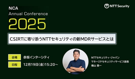 NTTセキュリティ・ジャパン株式会社(本社:東京都千代田区、代表取締役社長:関根 太郎、以下NTTセキュリティ・ジャパン)は、2025年12月18日(木)・19日(金)に開催される、一般社団法人日本シーサート協議会主催イベント「NCA Annual Conference 2025」に協賛します。イベントでは、NTT SecurityのMDRサービスをブースおよび講演にてご紹介します。