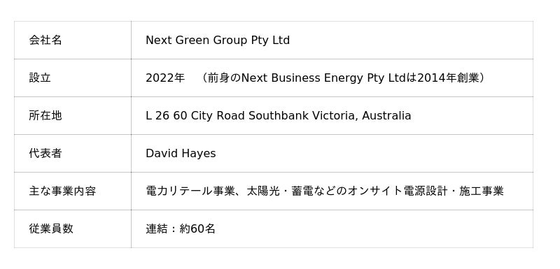双日株式会社(以下「双日」)は、豪州において電力小売および太陽光発電設備・蓄電池のEPC事業を展開するNext(ネクスト) Green(グリーン) Group(グループ) Pty Ltd(以下「NGG」)の発行済株式の一部を取得し、連結子会社化しました。本買収により、双日の連結子会社で、豪州で空調設備の設計・施工および省エネルギー事業を手がけるEllis(エリス) Air(エアー)、その傘下のClimatech(クライマテック)とのシナジーを創出し、空調設備の導入と電力供給、エネルギーマネジメントを組み合わせた統合的なエネルギーソリューション事業を展開していきます。