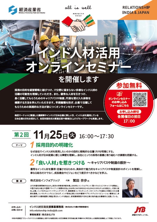 本セミナーは、株式会社JTBのインド人材交流支援事業の一環として、経済産業省「グローバルサウスとの連携強化に資する共創型技術人材交流事業費補助金(日印先端企業(半導体やAI)等交流による雇用促進事業)」を活用して実施されます。インド人材の採用を検討する日本企業を対象に開催され、採用目的の明確化から、優秀な人材を惹きつける制度設計、円滑な受け入れ体制の構築まで、実践的な方法を学ぶことを目的として開催されます。