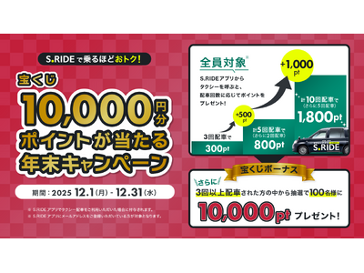 タクシーアプリ「S.RIDE(エスライド)」を提供するS.RIDE株式会社(本社:東京都港区、代表取締役社長:橋本洋平)は、日頃のご愛顧への感謝を込めて、2025年12月1日(月)~12月31日(水)の期間、「S.RIDE 年末宝くじポイントキャンペーン」を実施します。