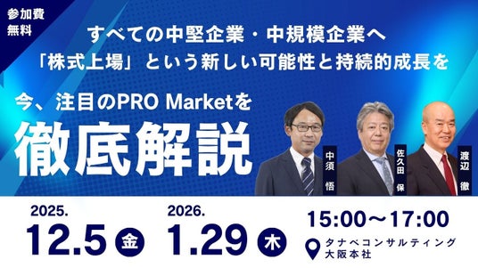 本説明会では、株式会社タナベコンサルティング 執行役員 IPO支援コンサルティング担当/ホールディングス・グループ経営担当 中須 悟、IPO支援 ゼネラルマネジャー 上場審査部長 佐久田 保、IPO支援 上場審査部長代理 渡辺 徹が登壇し、PRO Market上場のプロセス全体や、上場によって得られるメリット、成功のポイントについて、具体的な事例を交えながら実践的に解説いたします。