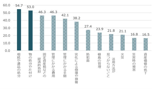 不安の要素としては「相続や遺品の処分」(54.7%)が最多、次いで「物の処分や片付け」(53.0%)という結果で、現実的な負担への懸念が目立ちました。一方で、「防犯面」(27.4%)、「火災」(21.1%)といった安全面への不安も一定数あり、空き家の適切な管理や見守りの重要性がうかがえます【図4-2】。
