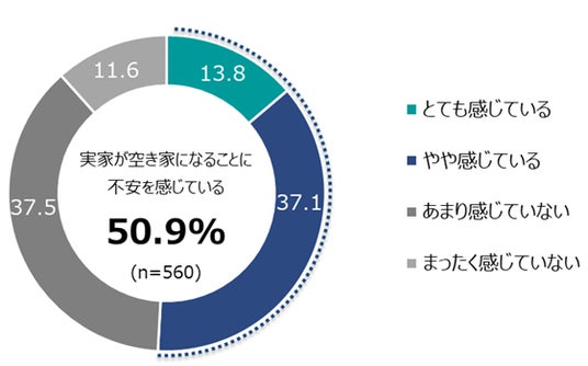 実家が将来的に空き家になることに対して不安を感じている人は全体の50.9%(「とても感じている」(13.8%)、「やや感じている」(37.1%)の合計)【図4-1】となりました。
