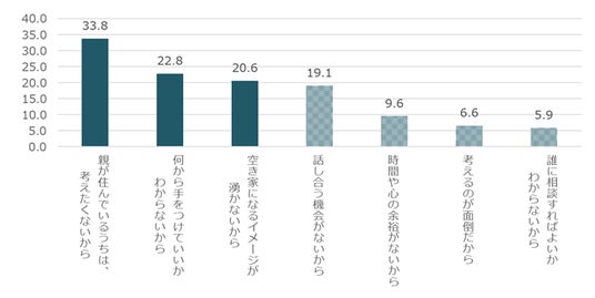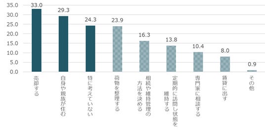 現在考えている具体的な対応方法については、「売却する」(33.0%)が最多、次いで「自身や親族が住む」(29.3%)、「特に考えていない」(24.3%)という結果となりました【図6-1】。「特に考えていない」理由は、1位「親が住んでいるうちは、考えたくないから」(33.8%)、2位「何から手をつけていいかわからないから」(22.8%)、3位「空き家になるイメージが沸かないから」(20.6%)でした【図6-2】。