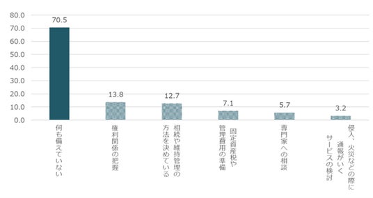 実家が将来空き家になったときの備えを聞いたところ、「何も備えていない」(70.5%)が最多で、7割が対応を講じていないことが明らかになりました【図5】。