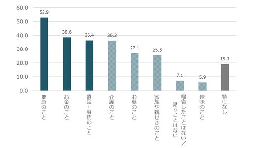 さらに、帰省した際、親と話しておくべきと考えていることは、「健康のこと」(52.9%)が最も多く、続いて「お金のこと」(38.6%)、「遺産・相続のこと」(36.4%)という結果となりました【図3】。別居の親の「健康面」に関する関心が高いほか、「金銭面」「相続」など、将来を見据えた話題への意識が高いことがうかがえます。