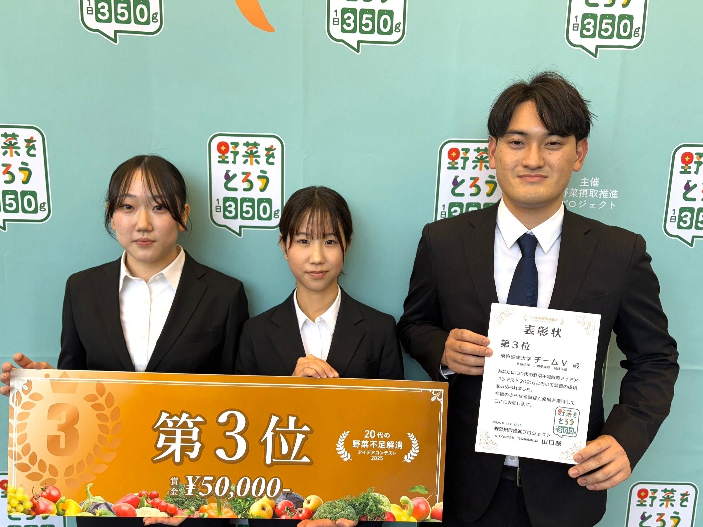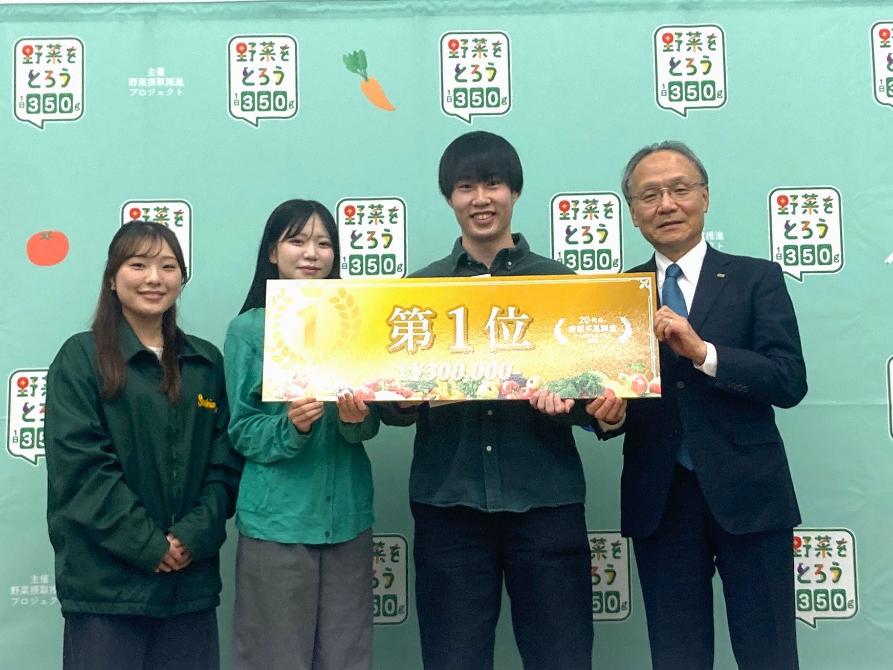 受賞のコメント:頑張ってきた事がこのような形で報われて嬉しいです。今回のアイデアを考える中で、野菜には 20代の悩みの解決につながる栄養がたくさん含まれている事を知りました。若者にも野菜摂取意識がしっかり芽生えると良いと考えています。