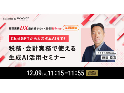 この度、株式会社インボイス(本社:東京都千代田区、代表取締役社長:仁多見 斎、以下「インボイス」)は、2025年12月9日(火)に開催する無料オンラインカンファレンス【経理業務DX最前線サミット 2025 Winter ~次世代の経理へ デジタルとAIによる業務プロセス改革13選~】へアクタス税理士法人(代表:粕谷 直人 本社:東京都港区)の藤田 益浩氏の登壇が決定したことをお知らせいたします。
