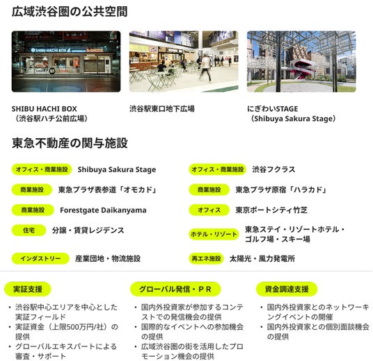 本プログラムは、世界が直面する環境課題の解決に挑む国内外の有望なグリーンテックスタートアップを6社程度採択し、広域渋谷圏での実証実験機会などを提供する取り組みです。実証フィールドとして、広域渋谷圏における公共空間や、東急不動産の多様なアセット(オフィスビル、商業施設、複合施設、ホテル、住宅等)を提供します。