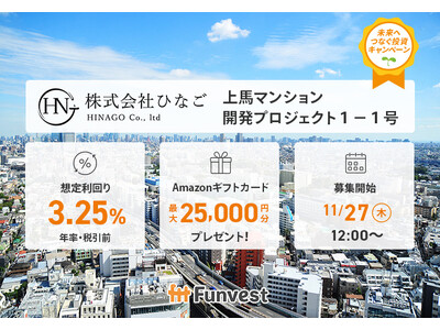「未来をわかちあう投資」を提供する「Funvest(ファンベスト)」(以下、Funvest)は、「ひなご 上馬マンション開発プロジェクト1-1号」(以下、本ファンド)の募集を11/27より開始しますので、お知らせいたします。
