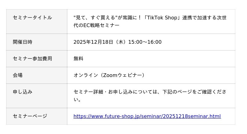~「futureshop」に登録済みの商品情報を「TikTok Shop」へ連携可能に。2025年12月18日(木)には特別セミナーも開催~