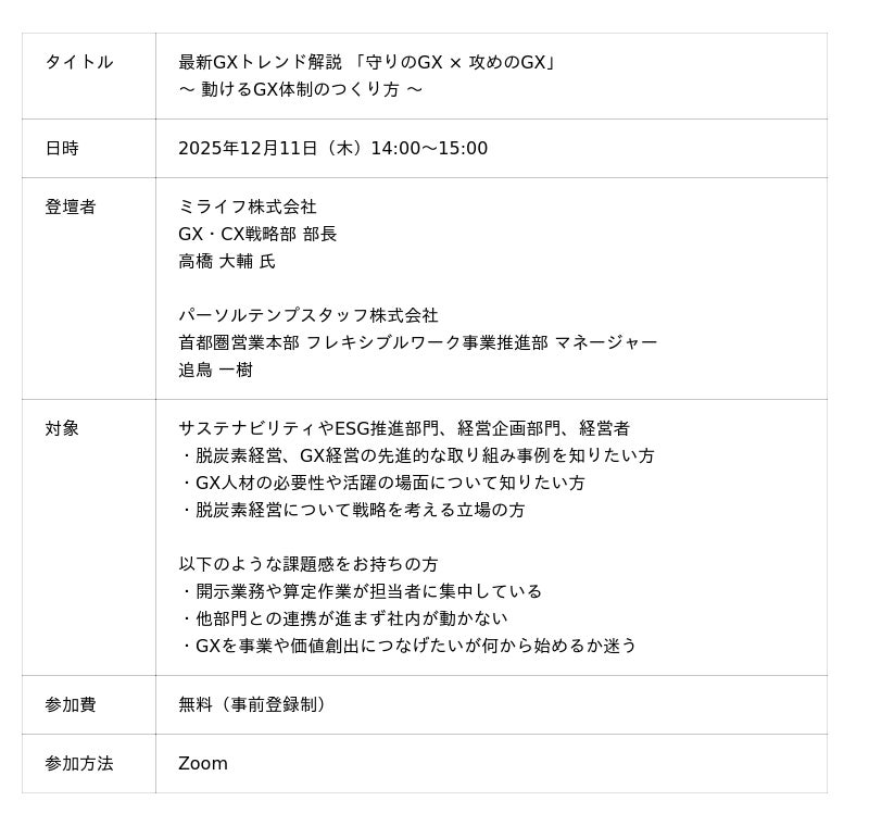 パーソルテンプスタッフ株式会社(本社: 東京都渋谷区、代表取締役社長: 木村 和成、以下パーソルテンプスタッフ)は、エネルギー販売および住宅関連事業を展開するミライフ株式会社(本社: 東京都品川区、代表取締役社長: 塚越 二喜男、以下ミライフ)と共同で、2025年12月11日(木)に、GX(グリーントランスフォーメーション)推進のためのオンラインセミナーを開催します。