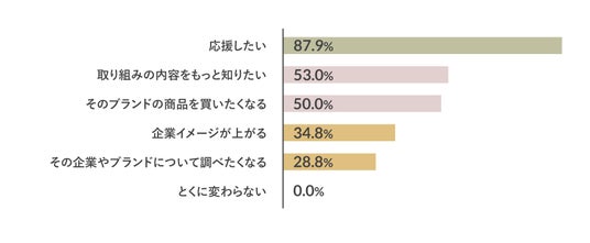 もっとも多かった回答が「応援したい」の87.9%。さらに「取り組みの内容をもっと知りたい」が53.0%、「そのブランドの商品を買いたくなる」が50.0%という結果になりました。
