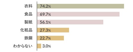 もっとも多かったのが「衣料」で、「食品」「製紙」「化粧品」「鉄鋼」と続きました。回答数は少なかったですが、ほかには「半導体」「AI」「データセンター」などの回答も上がりました。