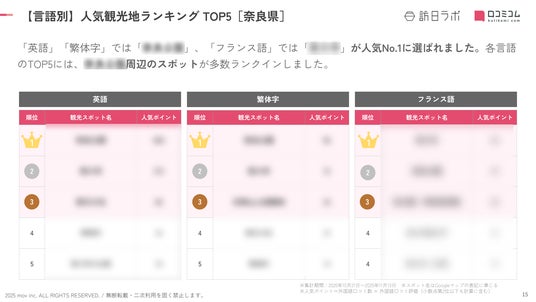 - 調査対象:訪日ラボが独自に選出した奈良県の観光スポット(計2,506 件)
