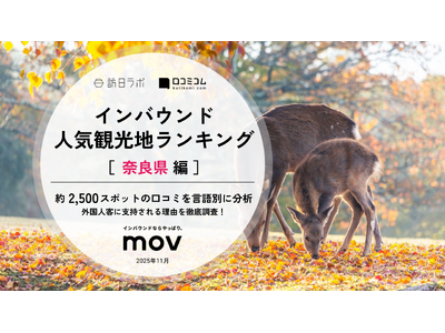 業界最大級のインバウンドビジネスメディア「訪日ラボ」及び 店舗向け集客一元化プラットフォーム「口コミコム」を運営する株式会社mov(代表取締役:渡邊 誠、本社:東京都渋谷区、以下mov)は、奈良県の観光地に寄せられた最新の口コミデータから、独自の『インバウンド人気観光地ランキング』を発表しました。