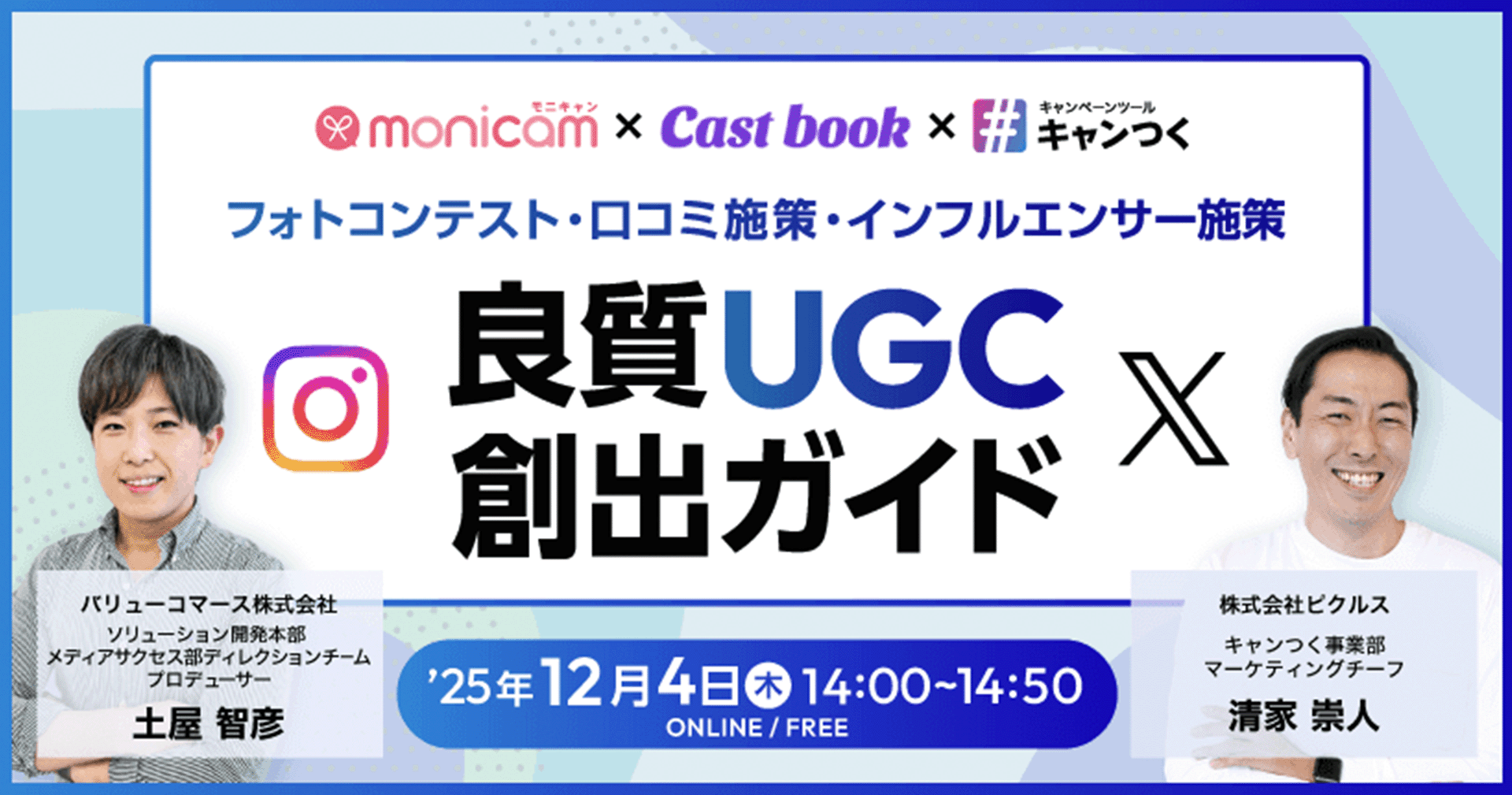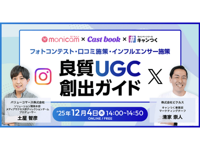 株式会社ピクルス(以下、ピクルス)は、「Castbook」「monicam」を提供するバリューコマース株式会社(以下、バリューコマース)と共同で、12月4日(木)に無料ウェビナー『「良質UGC」創出ガイド|フォトコンテスト・口コミ施策・インフルエンサー施策 』を開催します。